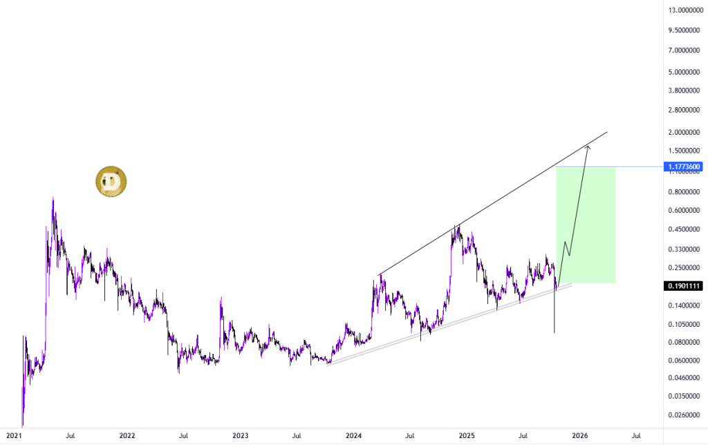 - Looking at the long-term chart, DOGE is currently trading around $0.19 within a well-defined ascending channel, with potential upside targets ranging from $1.17 to $1.50. The technical setup looks bullish, suggesting the meme coin could bounce back as long as it stays within this rising trend.