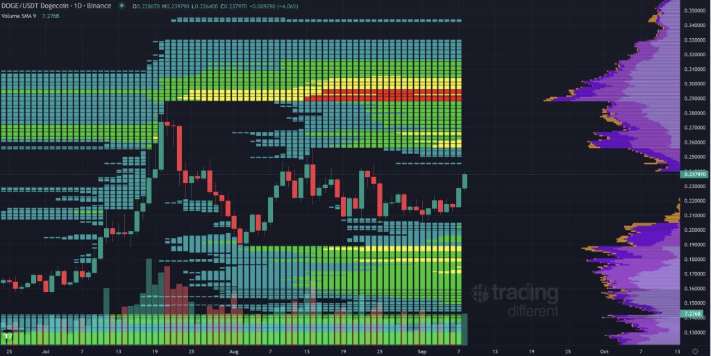 DOGE is currently hovering around $0.238, which puts it in a sweet spot between major liquidity zones. The bulls have built a solid foundation with heavy buy-side liquidity stacked between $0.18-$0.20 – that’s your safety net if things go south. But the real excitement is up north, where sell-side clusters are waiting around $0.26-$0.28. Those recent green candles aren’t just random noise either; they’re suggesting something bigger might be brewing.