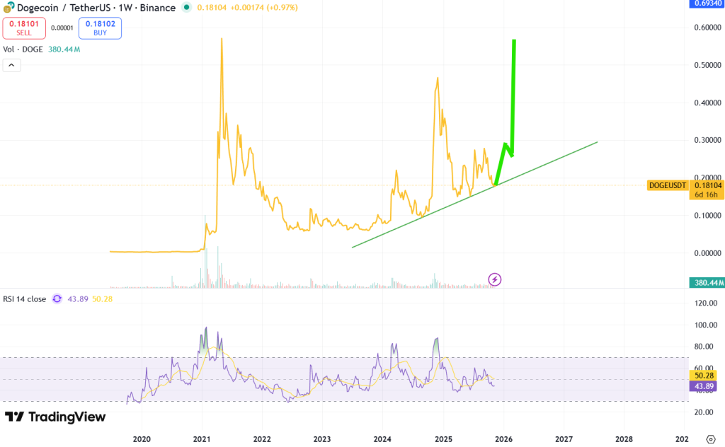 - Dogecoin’s weekly chart just touched a major resistance level and looks ready to break out. The price is hovering near $0.18 on Binance, repeatedly bouncing off a multi-year ascending trendline while testing a resistance zone formed by previous weekly highs. A projected upward move has traders excited, though new regulatory proposals could complicate the picture.