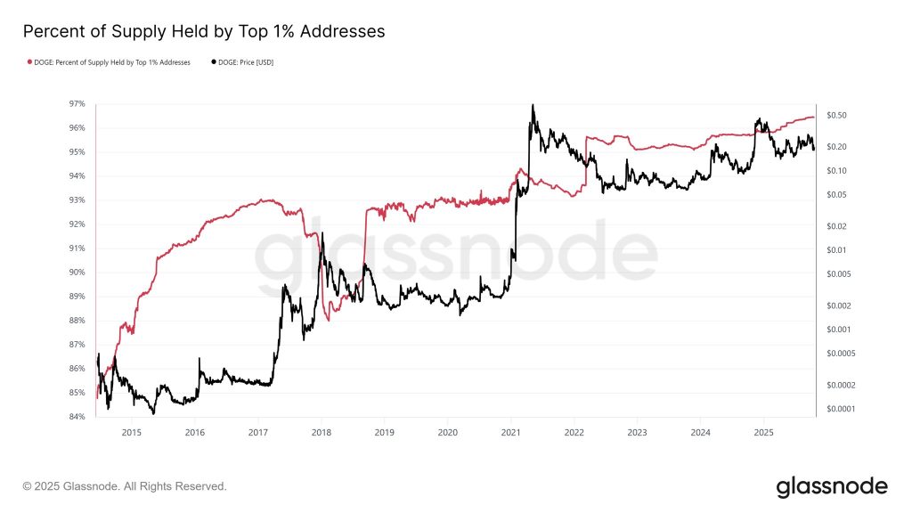 - Recent data from Glassnode, shared by analyst Cryptollica, shows that the top 1% of Dogecoin addresses now control nearly 97% of the total supply. What’s notable is that this concentration keeps growing even as DOGE’s price rises. The chart makes this clear: both whale holdings (red line) and price (black line) are moving up together, meaning major players aren’t selling despite recent gains.
