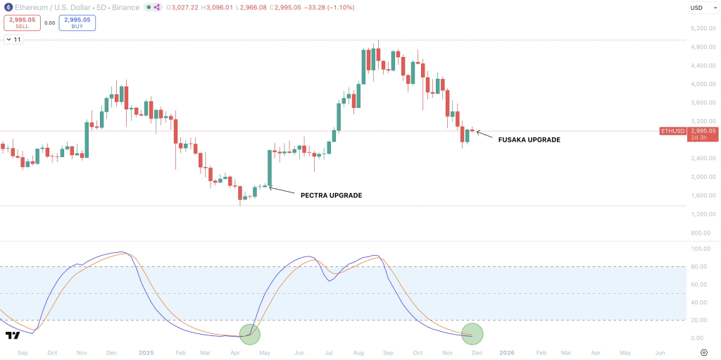- The Pectra Upgrade earlier this year kicked off a massive rally in ETH’s price, with the asset surging nearly 300% in subsequent months. Charts show that sharp climb starting shortly after Pectra went live. Right now, ETH has pulled back and leveled off again ahead of the next scheduled upgrade. The momentum indicator shows a trough comparable to the one that formed before the previous rally, adding weight to the idea that price behavior heading into Fusaka is following the same playbook.