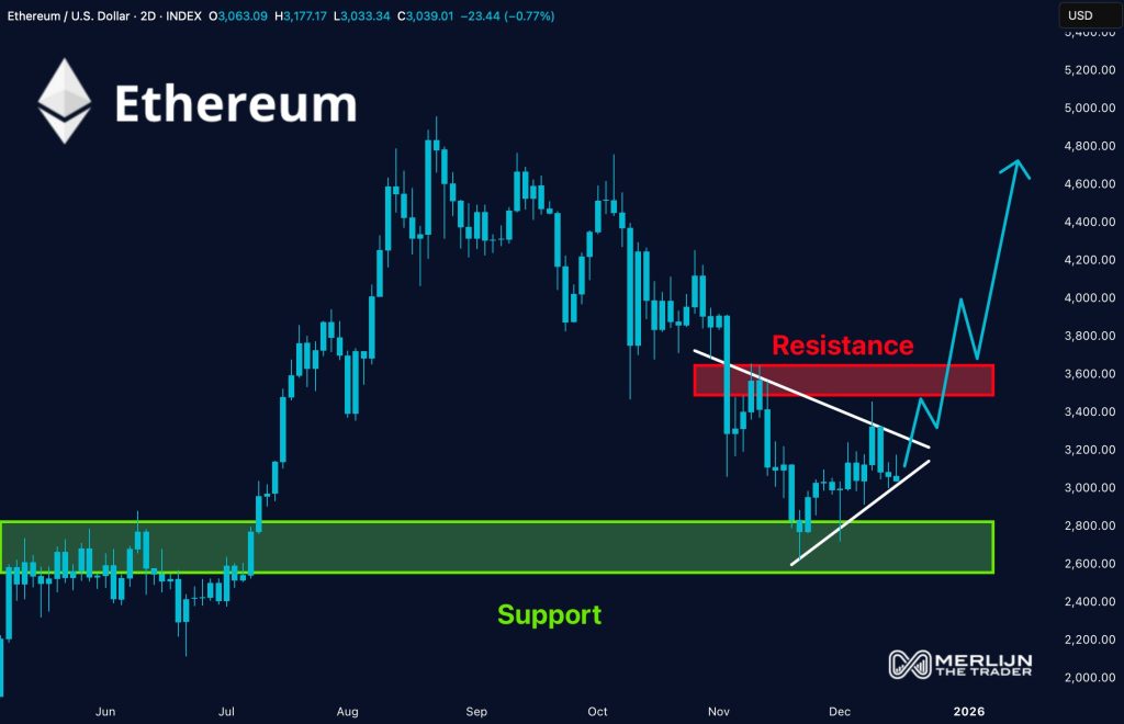 “ETH is currently coiling, with price action compressing between rising short-term trendlines and overhead resistance.”