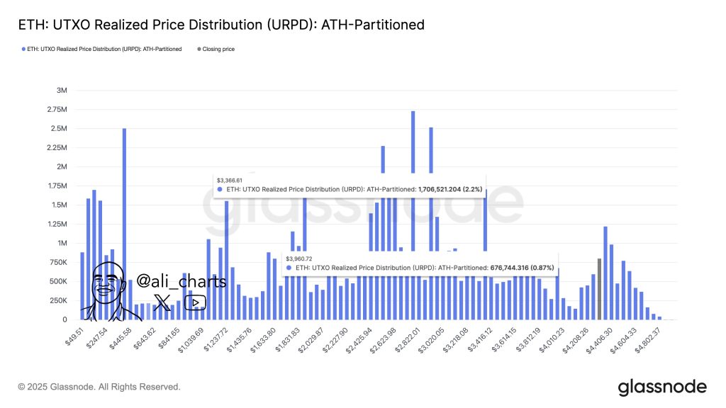 Ethereum is getting plenty of attention as everyone tries to figure out where it’s heading next. The folks at Glassnode have crunched the numbers on their UTXO Realized Price Distribution, and they’ve pinpointed two levels that really matter: $3,960 and $3,360. These are the spots where tons of ETH last changed hands, making them super important for understanding whether Ethereum can hold its ground.