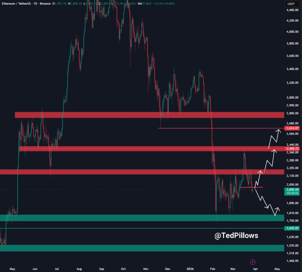 The main bearish risk comes from a possible rejection at this psychological level. If Ethereum fails to reclaim $2,000, the chart structure suggests a move toward lower demand zones located near $1,800 and $1,700. These areas represent the next strong liquidity clusters where buyers could attempt to stabilize price.