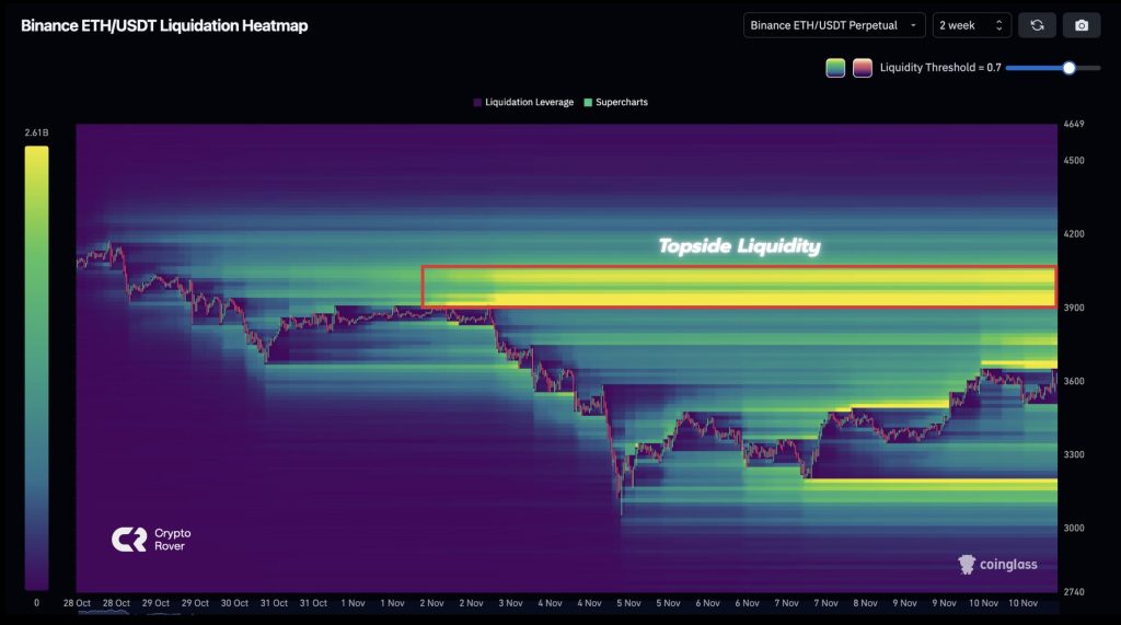 - There’s a massive liquidity cluster sitting right at ETH’s range highs between $3,900 and $4,000. The Binance liquidation heatmap lights up bright yellow and green in this zone—a clear sign that tons of leveraged positions are stacked there. With ETH trading well below these levels right now, the setup is pretty straightforward: if momentum kicks in, the market has every reason to push toward that liquidity and sweep those positions.