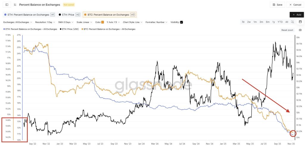 - The latest chart shows ETH supply on centralized exchanges has fallen to roughly 10%, while Bitcoin hovers around 14%—a reversal of the historical pattern where Ethereum was typically more liquid on exchanges.