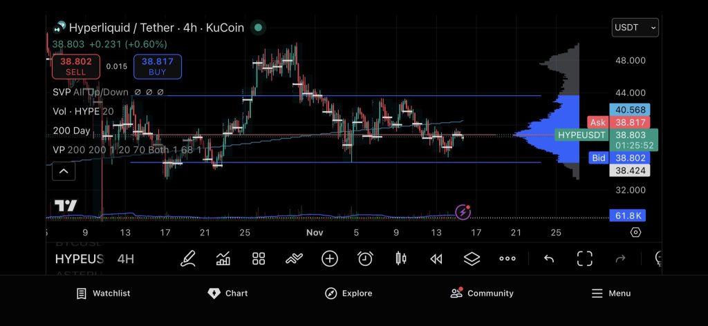- The 4-hour chart shows HYPE trading sideways for weeks, with price stuck between clear support and resistance levels while liquidity accumulates.