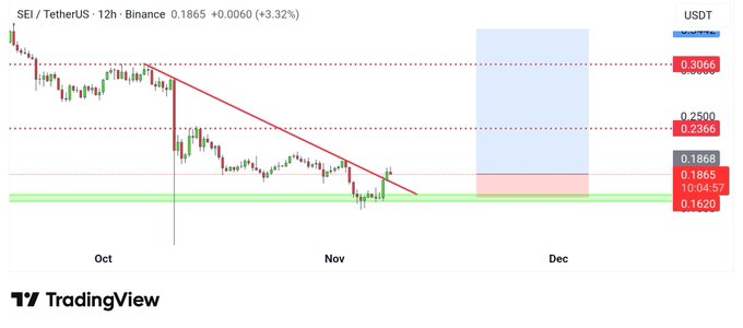 - The chart shows SEI tested this green support zone multiple times and bounced each time, building a solid base. Breaking that downtrend line is a big deal—it shows sellers are losing steam and hints at a possible reversal.