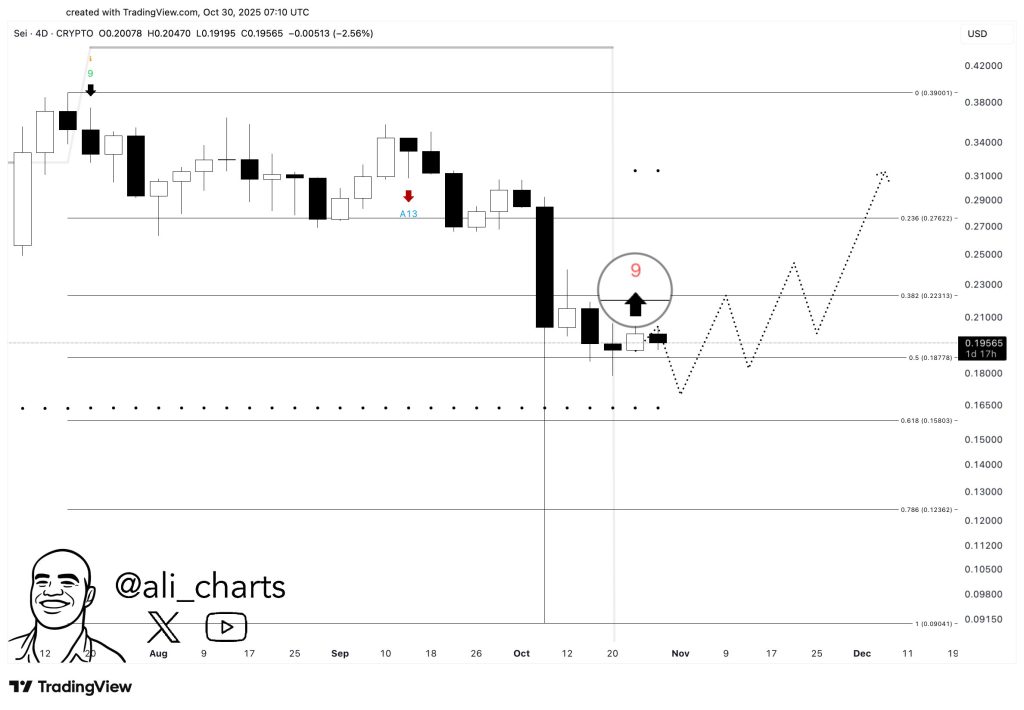 According to analyst Ali, if SEI holds above $0.19 support, it could climb toward $0.31 in the coming weeks. The 4-day chart reveals a clear TD Sequential “9” buy setup right after SEI’s steep drop in mid-October. Since then, the coin has been consolidating tightly between $0.18 and $0.20, signaling that sellers are running out of steam.