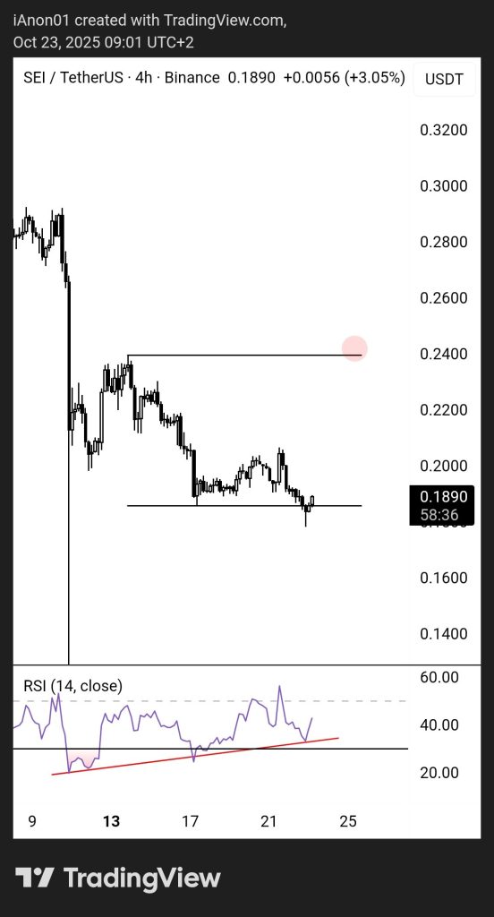 - According to the analyst, “SEI’s triple 4-hour divergence is one of the most reliable bullish structures we’ve seen lately, with the upper range around $0.24 being a logical short-term target.” Many traders think SEI might be setting up for accumulation based on the oversold RSI readings.