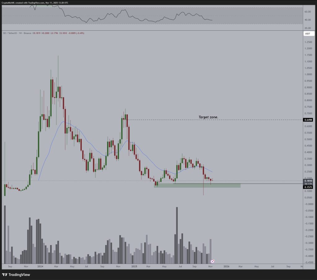 - SEI is trading around $0.18, sitting within a well-defined weekly support zone between $0.17 and $0.18. The chart shows a long-term downtrend beginning to flatten, with rising volume near support and a subdued RSI—classic signs of accumulation. This is the same price region that previously triggered a rally of over 2x, though current market interest remains muted.