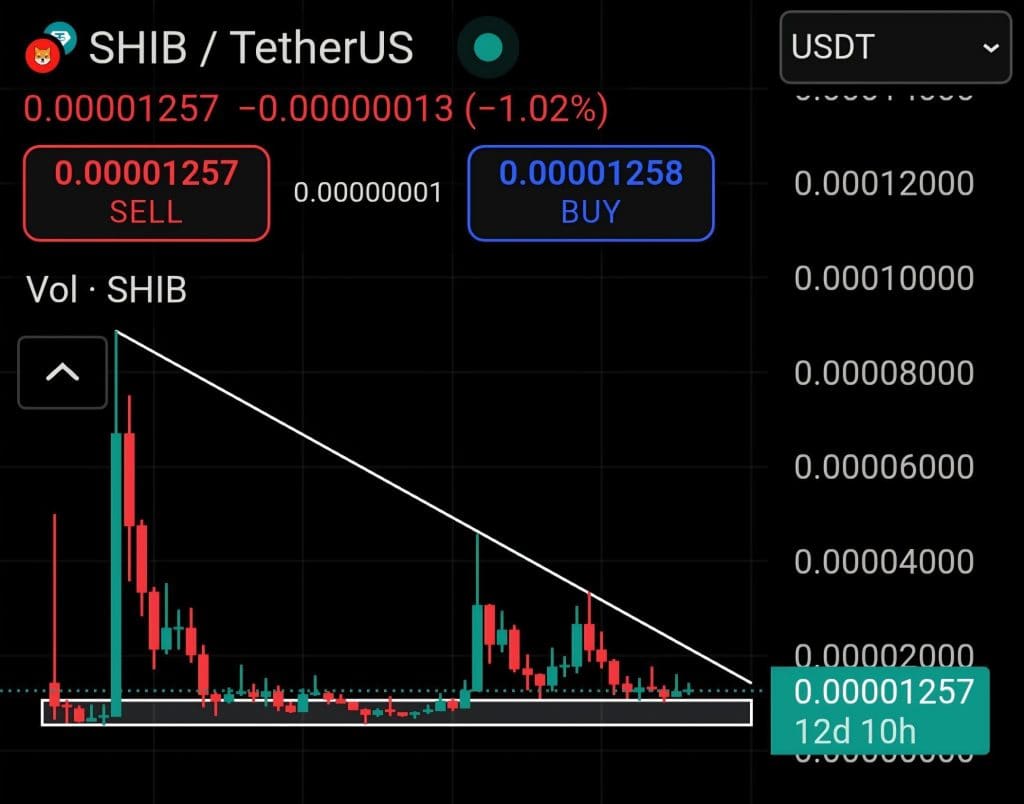 Shiba Inu is currently trading at $0.00001257, down 1.02% for the day. The token has been forming a descending wedge pattern that’s testing traders’ patience as it hovers just above key support levels.