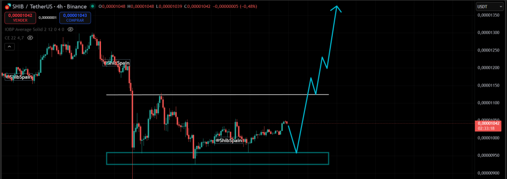 On the 4-hour Binance chart, SHIB is trading around $0.00001042, down slightly by 0.48% but holding firm after repeatedly testing its critical support zone between $0.0000090 and $0.0000100. This blue rectangular area marks the main accumulation range where strong buying activity has kept prices from falling further.
