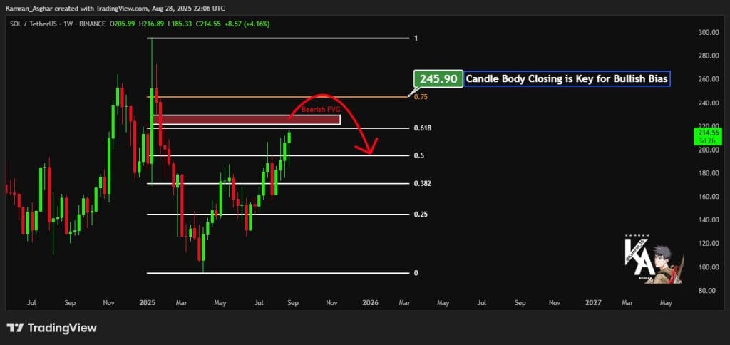 SOL climbs to $214.55 with eyes on $245.90 breakout level, where weekly candle close will determine if bulls can sustain upward momentum or face rejection.