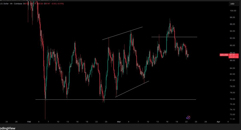 The chart shows SOL trading near $87 after being rejected from the $94-$96 region. The attempted breakout failed to hold, reinforcing the importance of the $92-$93 resistance zone. This area now continues to cap upside attempts.