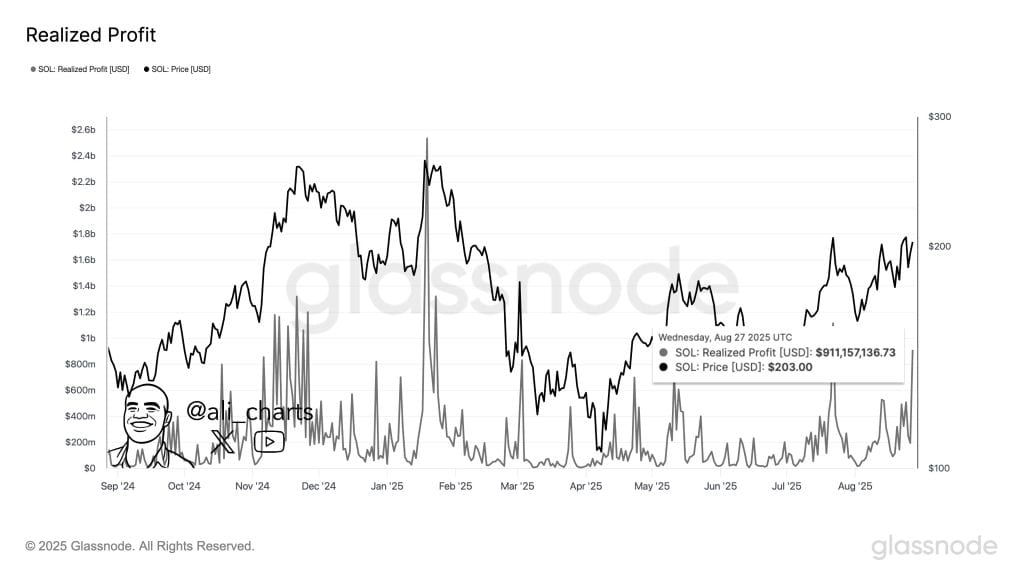 Solana’s recent rally delivered impressive returns for traders. On-chain data reveals that realized profits reached $911 million when SOL broke through the crucial $210 resistance barrier. The token currently trades around $203, maintaining its position above important psychological levels.