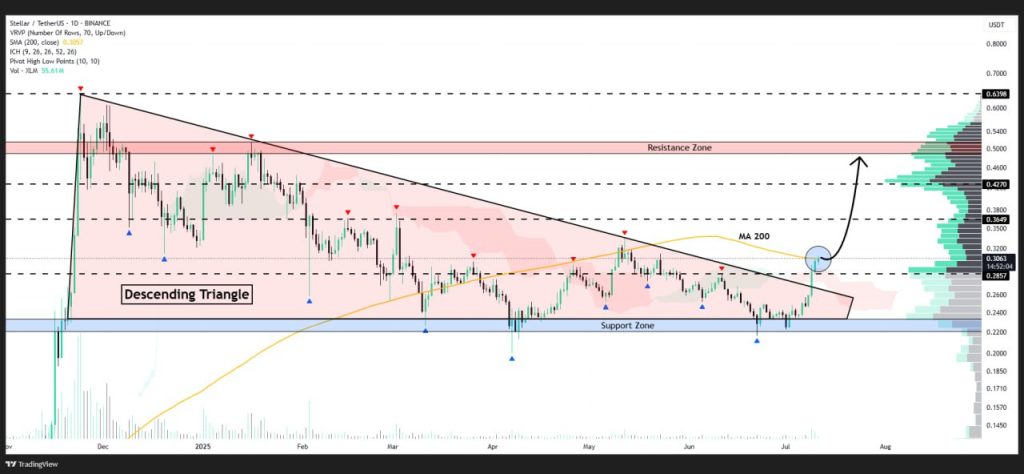 - This setup matters because descending triangles often precede larger directional moves once resolved. Stellar’s ability or failure to hold above the 200-day moving average will likely define near-term momentum and shape market expectations for XLM as the consolidation phase approaches its later stages.