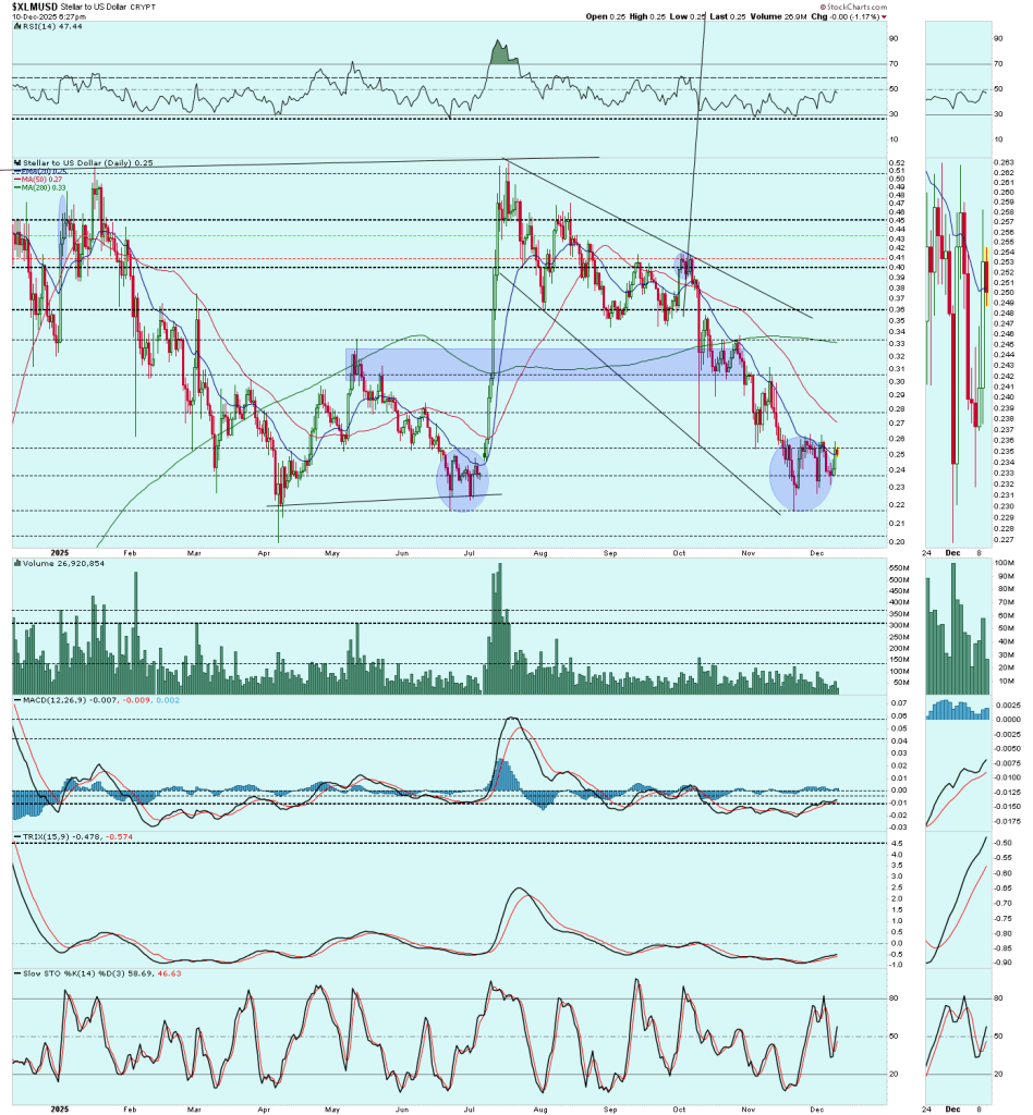 - In a recent statement, Andy Heilman, CFA, highlighted that XLM continues to show improving technical strength on the daily chart. As noted, “Daily XLM looks good here… this just does not look anything but bullish to me at this point,” with only a sustained move below 23 cents prompting a reassessment. The chart reinforces this outlook, with price action holding above key support and forming what appears to be an ascending triangle pattern, a structure often associated with trend continuation.