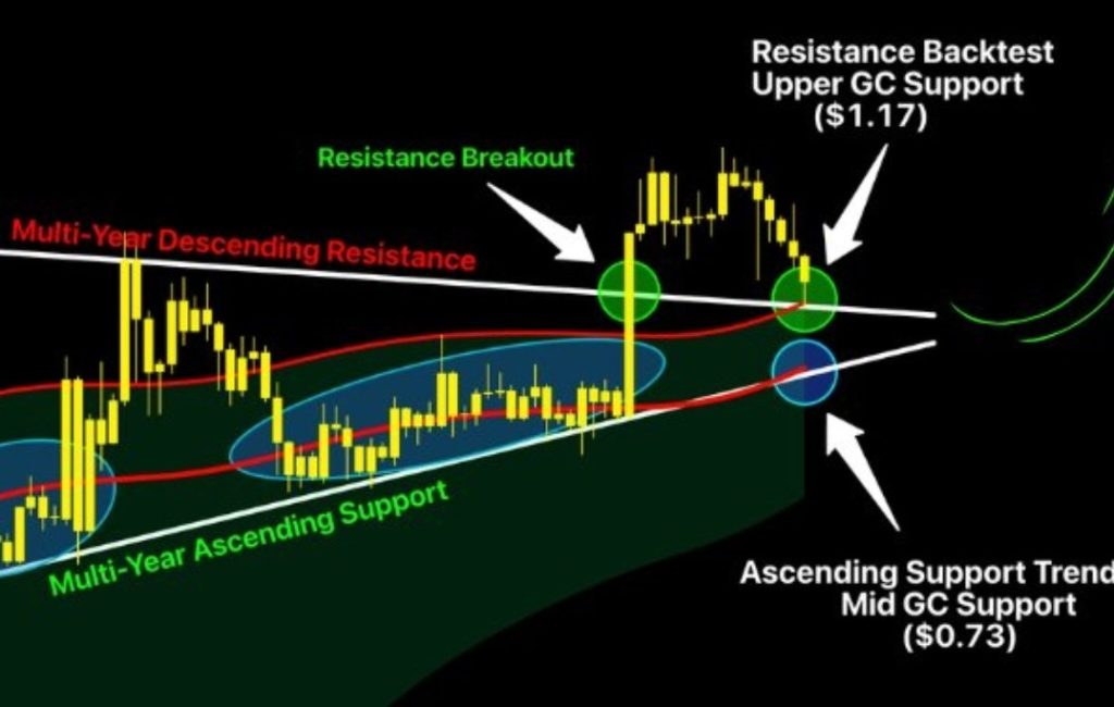 The chart highlights a previously broken multi-year descending resistance trendline that capped XRP’s upside for an extended period. After breaking above that structure, price pulled back toward upper support near $1.17.