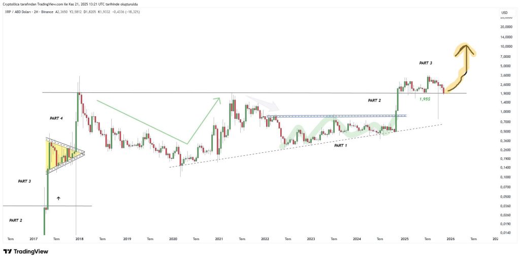 XRP has entered what analysts describe as the beginning of a broader bull market phase. The latest structural breakout suggests XRP has officially transitioned into a new cycle after reclaiming a key resistance level. The chart shows the asset holding near the $1.90 to $2.00 area, maintaining its position above a major long-term threshold.