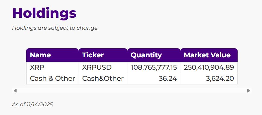 - The fund currently holds 108.76 million XRP tokens valued at $250.41 million, plus a small cash reserve of $3,624.
