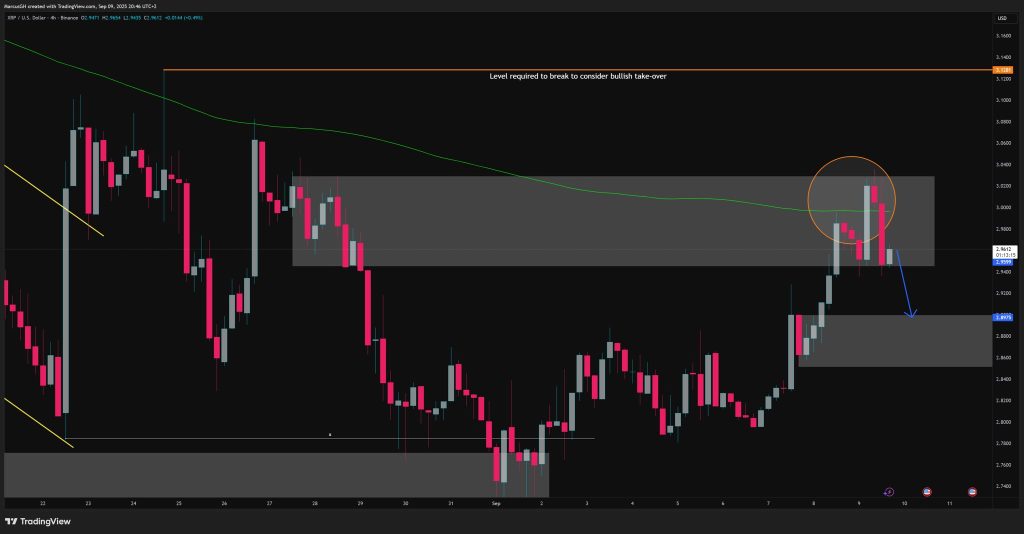 XRP tried to punch through the $3.00 ceiling again and failed spectacularly. The rejection wasn’t just at any random level – it happened right where the 200 EMA sits, creating a perfect storm for sellers. Now the question is whether $2.89 can hold the line.