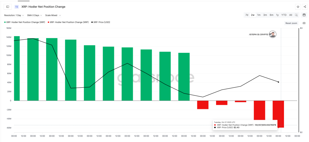 - After nearly two weeks of steady buying (green bars), holders suddenly switched to heavy selling (red bars). Meanwhile, XRP’s price held around $2.43, suggesting investors started taking profits near recent highs instead of continuing to accumulate.