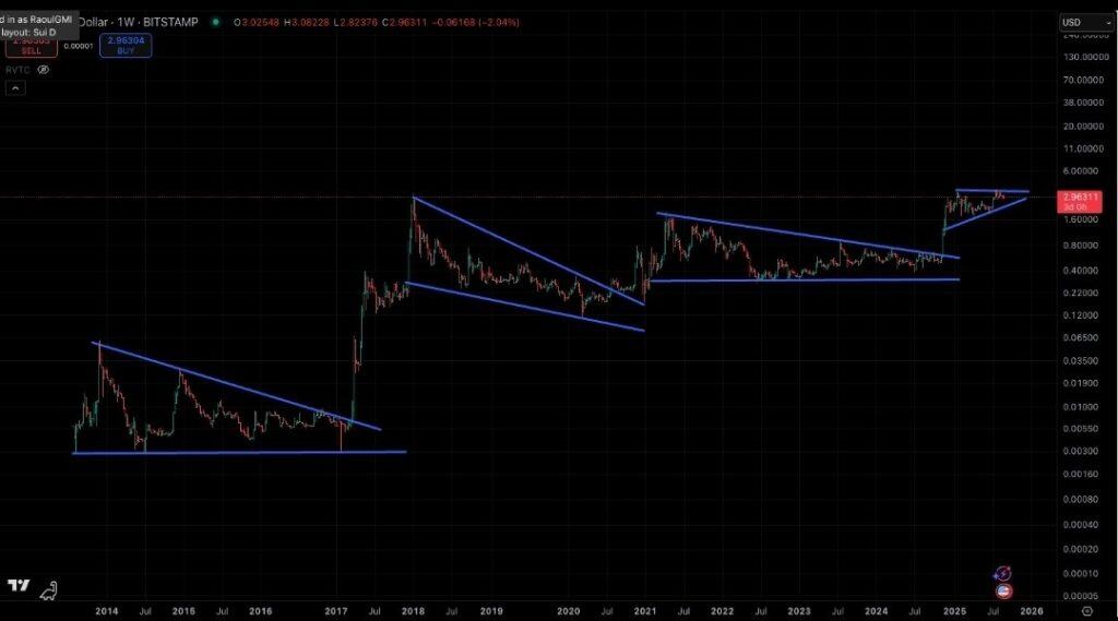Currently trading near $2.96, XRP has successfully defended its recent gains amid broader market fluctuations. Weekly chart analysis reveals a distinctive wedge formation – a technical setup frequently associated with substantial price breakouts.