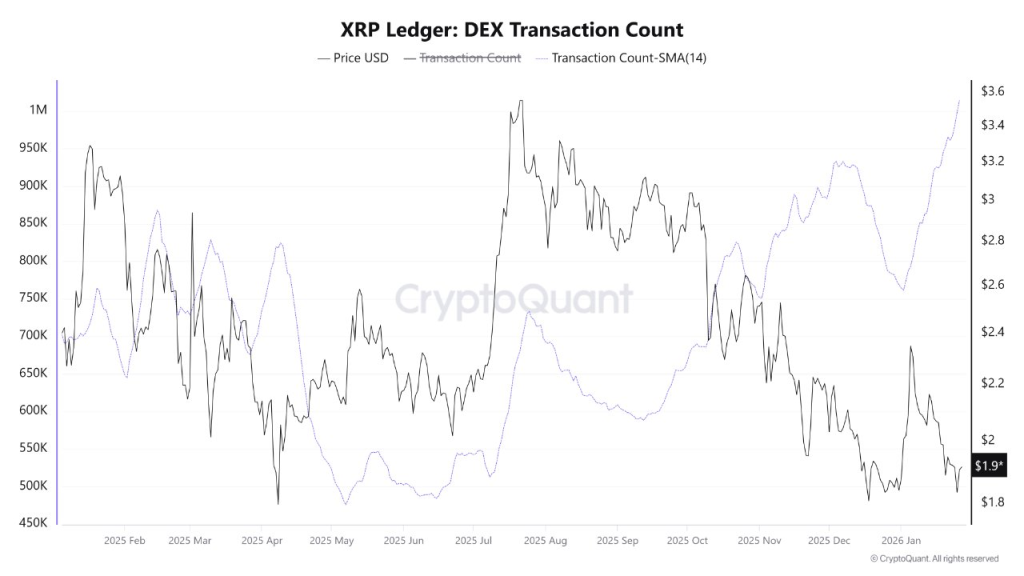 On-chain indicators show that the 14-day moving average of XRP Ledger DEX transactions has risen to approximately 1.014 million, confirming a clean breakout above a level that capped activity for much of last year.
