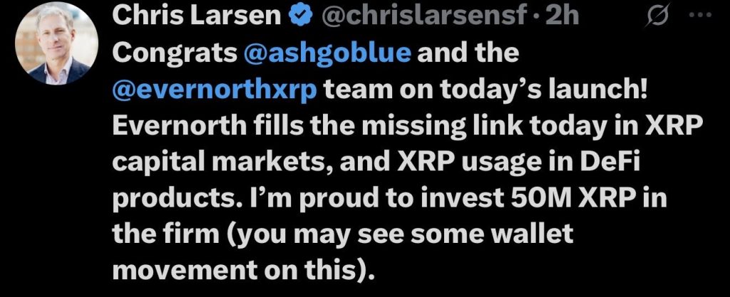 - As Larsen wrote: “Evernorth fills the missing link today in XRP capital markets, and XRP usage in DeFi products. I’m proud to invest 50M XRP in the firm (you may see some wallet movement on this).”