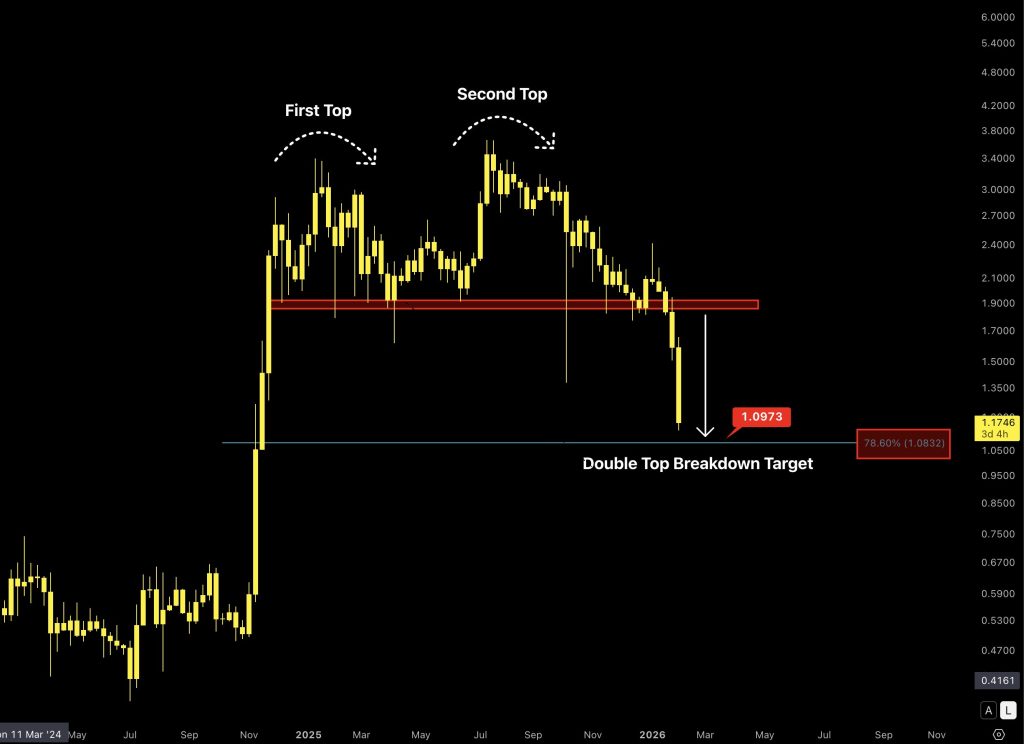 The chart suggests that a clean breakdown below the $1 handle would significantly increase downside vulnerability. Below this level, structural support is limited until the $0.70 region, which previously acted as a consolidation base. The steep nature of the decline following the breakdown indicates aggressive distribution rather than a controlled pullback, consistent with classic double-top behavior.