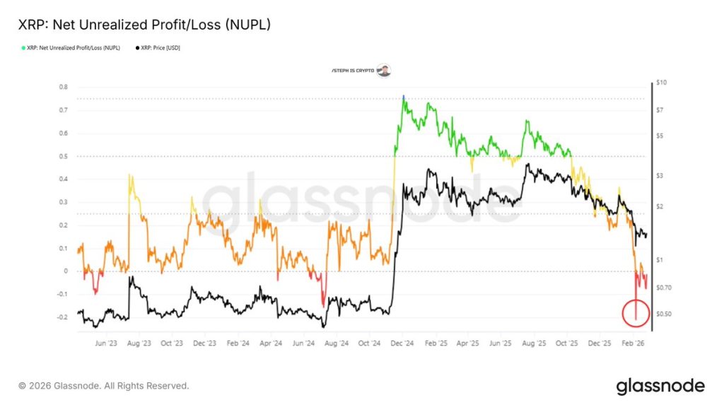 XRP slid toward the $0.50 level in late February 2026 as on-chain data signaled a full sentiment reset across the network. The Net Unrealized Profit/Loss metric has now moved into negative territory, confirming that most holders are sitting at a loss following the steep correction from late-2025 highs.