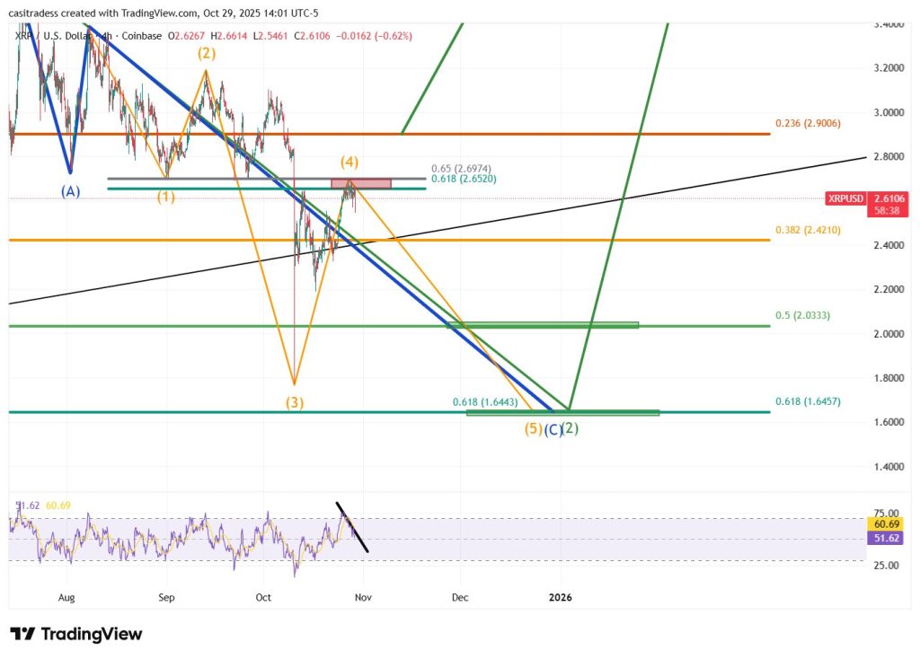 The next move targets the $1.64–$1.65 range, marked by a 0.618 Fibonacci extension, where Wave (5) is expected to bottom out. This kind of setup often signals the end of a correction before a longer-term reversal kicks in—potentially setting XRP up for a bullish run into 2026.