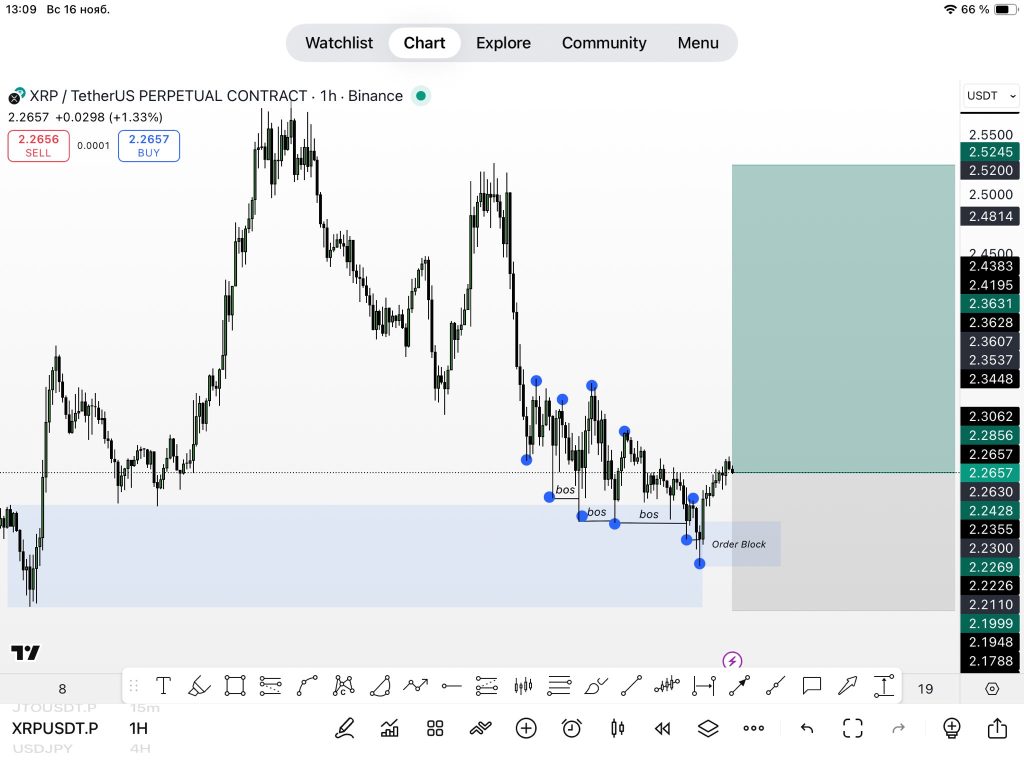 - The setup carries both opportunity and risk. XRP is currently trading around 2.2657, bouncing from an order block near 2.23–2.24. Multiple break-of-structure confirmations suggest short-term bullish momentum, but the stop-loss at 2.1499 presents meaningful downside risk, especially for leveraged positions.