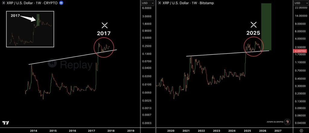 - In a recent market observation, a crypto analyst pointed to a notable resemblance between XRP’s current price structure and the one that preceded its major rally in 2017. The comparison is based on a weekly XRP/USD chart that places the 2017 and 2025 price cycles side by side, emphasizing how both periods feature extended consolidation phases following a broader accumulation trend.