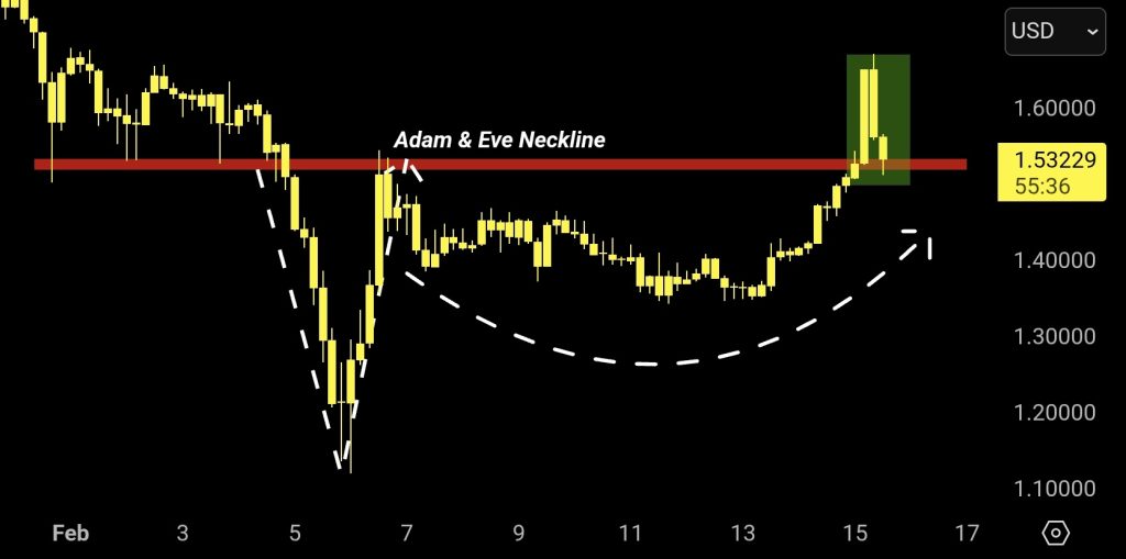 The chart structure shows a clear breakout above the horizontal resistance zone labeled as the Adam & Eve neckline. After clearing that level, XRP pulled back in a controlled manner toward the $1.50 area. This type of retest is common in bullish continuation patterns. If buyers successfully defend the neckline, it would confirm that resistance has flipped into support, reinforcing the broader bullish structure.