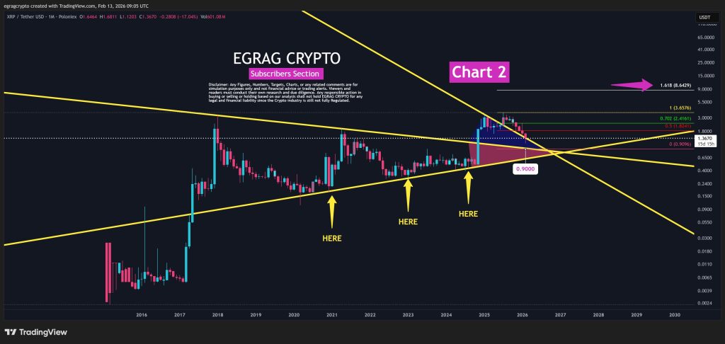 EGRAG emphasizes the psychological dimension of market cycles, stating that markets reward conviction under pressure rather than comfort. The current XRP setup therefore reflects a crossroads between deeper capitulation with larger upside potential, or a moderated correction with a lower long-term ceiling.