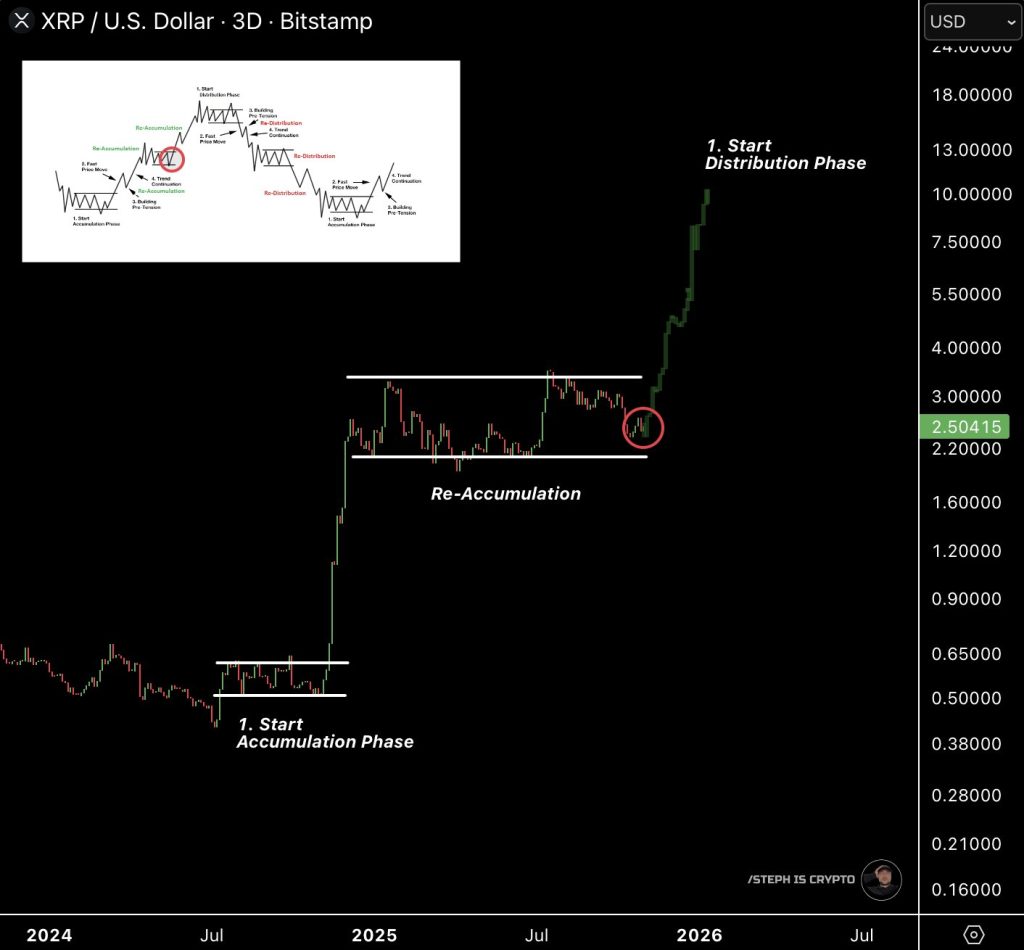 - A recent technical analysis indicates XRP could be approaching a significant upward move, based on a multi-year Wyckoff-style chart pattern. The analysis shows XRP completed its accumulation phase in early 2025, followed by a sharp markup and an extended consolidation period around $2.50. The chart now suggests XRP is breaking out of this consolidation zone and entering what’s traditionally the strongest part of the cycle—the distribution phase, where rapid price expansion typically occurs.