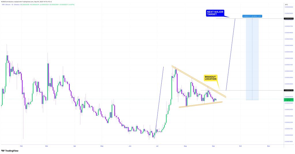 XRP is setting up for what could be a game-changing move. On the daily chart, XRP against Bitcoin (XRP/BTC) has created a symmetrical triangle – one of those textbook patterns that traders love to see before big moves happen.