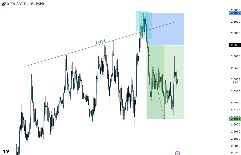 After a quick rally that pushed toward $2.70, XRP reversed exactly as anticipated, allowing them to close their trade at the pre-identified target around $2.60. The 15-minute chart tells the story: a liquidity sweep above trendline resistance followed by a sharp drop back into consolidation—textbook technical execution.