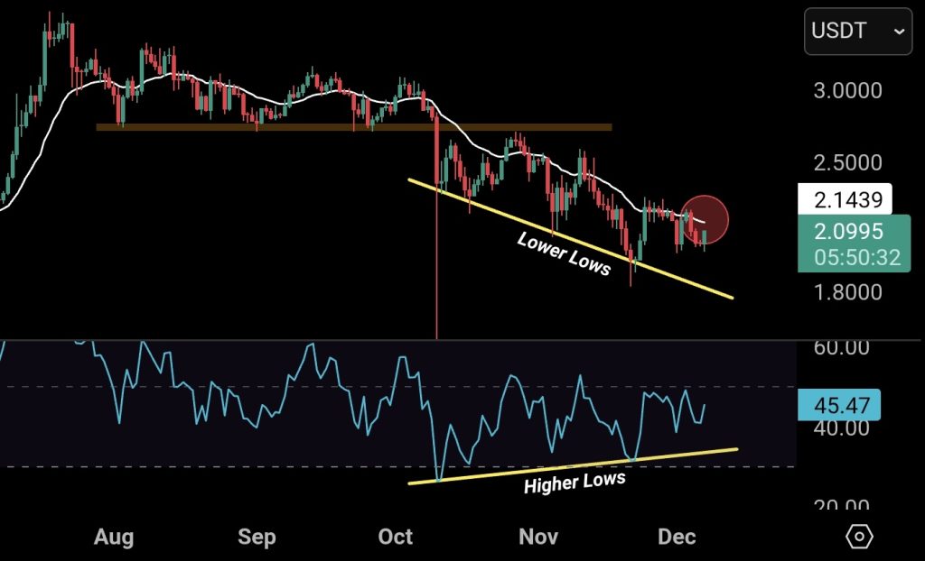 “The altcoin is currently showing a bullish divergence, where price continues to form lower lows while the RSI creates higher lows.”