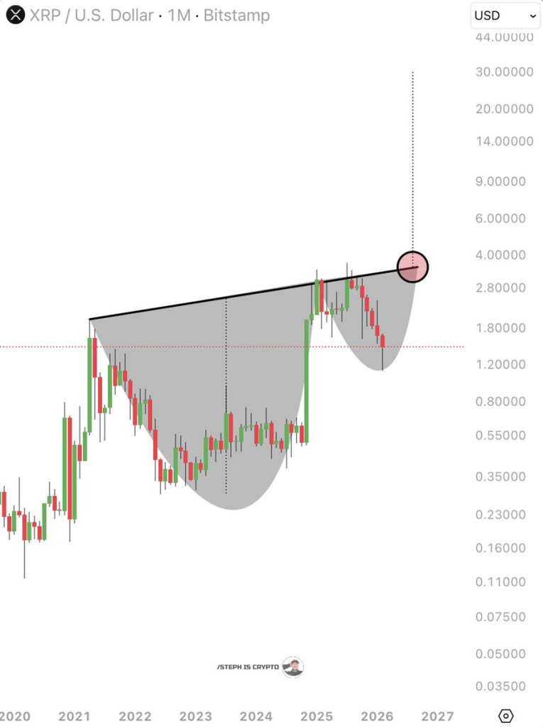 XRP may be developing one of the most structurally significant bullish formations on its long term chart. The XRP/USD pair on Bitstamp is forming a multi year cup and handle pattern on the monthly timeframe — a setup that, if confirmed, could imply a measured move toward the $30 region.