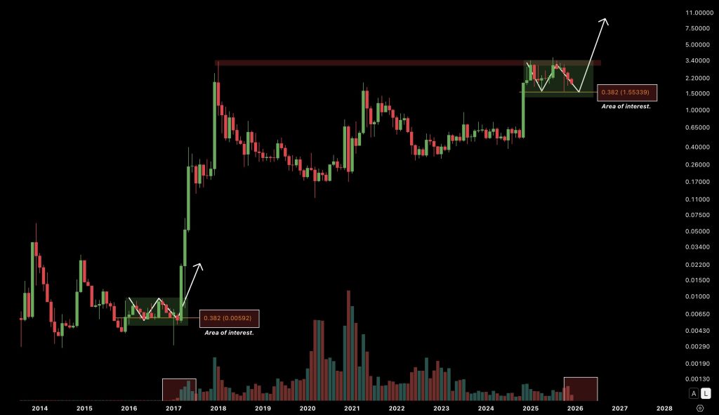 XRP is currently trading near a crucial technical area as the price approaches the lower edge of its multi-month range. Market focus has shifted to a potential sweep of these range lows, which could pull XRP into what traders are calling an “area of interest” on the long-term chart. This zone lines up with the 0.382 Fibonacci retracement—a level that played an important role back in 2017.