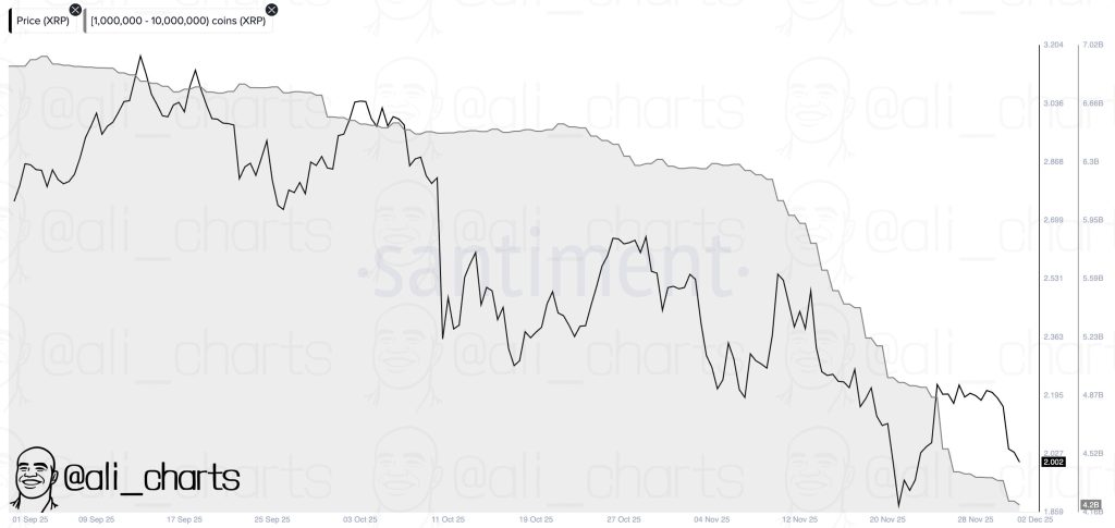 Wallets holding 1,000,000 to 10,000,000 XRP have been steadily decreasing their balances for several weeks, aligning closely with the persistent drop in XRP price.