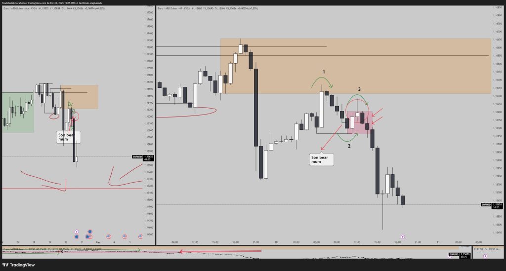 - Step 3 – Breakdown Confirmed: Price failed to hold above the supply region, broke below 1.1580, and formed a lower low—signaling that sellers were firmly in control.