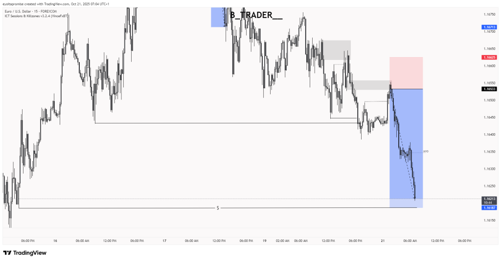 - EUR/USD rejected from a bearish order block near 1.1662–1.1671, then reversed sharply toward 1.1618, following Smart Money Concepts principles.