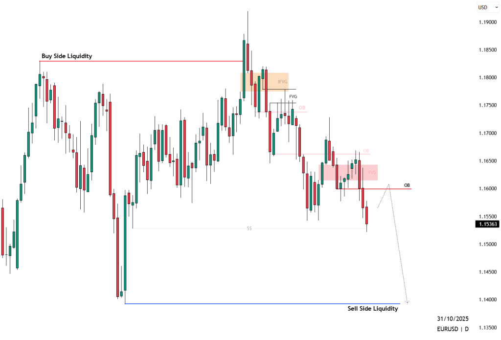 The daily chart tells a pretty straightforward bearish story. Price keeps getting smacked down from an order block near 1.1600, and each bounce has been cleanly rejected. Here’s what’s standing out: