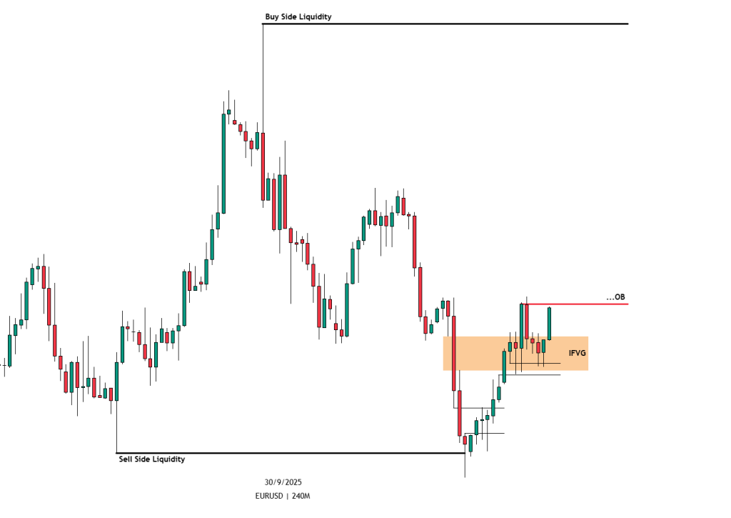 The 4-hour chart reveals several compelling elements. EUR/USD swept sell-side liquidity before reversing upward—a classic sign that stops below have been triggered. Price is now consolidating within an imbalance zone (marked in orange), suggesting buyers are actively absorbing available supply. Just above sits a fresh order block whose defense will be critical for bulls looking to push higher. If this support holds firm, buy-side liquidity at elevated levels becomes the logical next target.