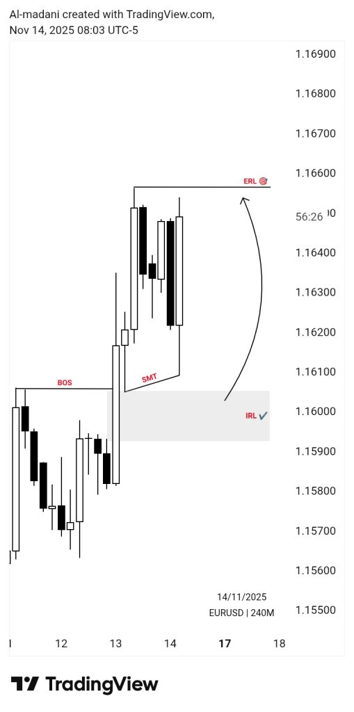 - EUR/USD delivered a fast, decisive move across key market levels on the 4H chart, leaving many traders without an entry opportunity. The price action revealed a rapid shift: EURUSD tapped the IRL zone near 1.1600, formed a Break of Structure (BOS), then created an SMT deviation before accelerating upward toward the ERL area around 1.1660. This sudden rally unfolded without a meaningful pullback, sidelining many traders during one of the cleanest structural reactions of the week. The move coincides with growing policy discussions around new tax proposals that could reshape financial market dynamics.