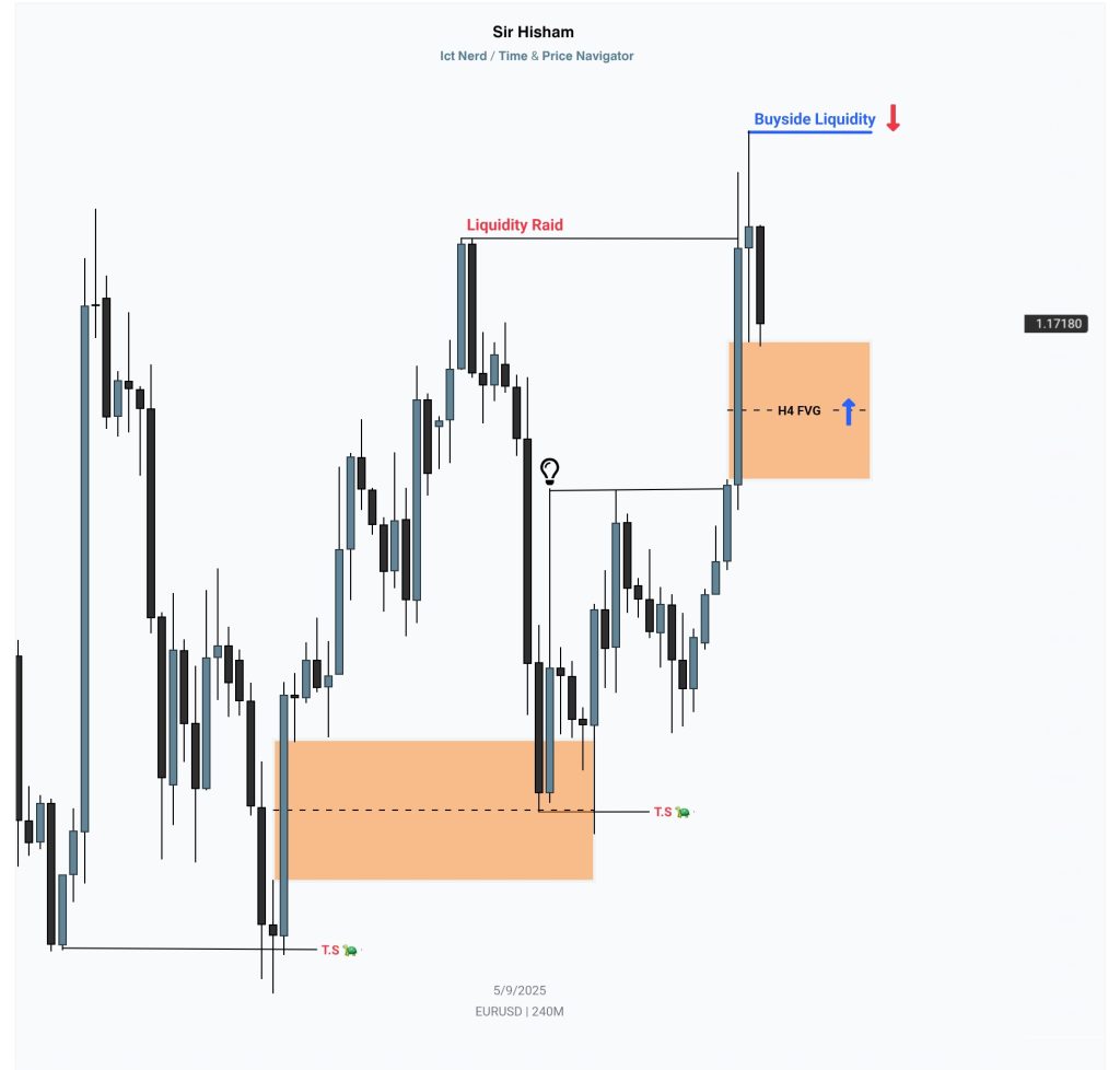 The 4-hour EUR/USD chart shows some really interesting developments that support the bullish case. We saw a classic liquidity raid where price dipped down to sweep out stop losses before reversing sharply higher – this kind of move often signals that bigger players are getting ready to push price in the opposite direction.